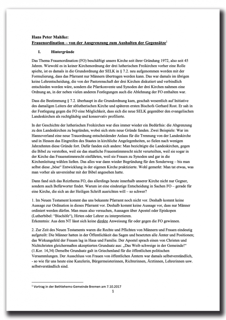 Hans Peter Mahlke hielt 2017 in der Bremer Bethlehems-Gemeinde den Vortrag „Frauenordination – von der Ausgrenzung zum Aushalten der Gegensätze“. Mahlke behandelt die Kontroversen und unterschiedlichen Positionen zur Frauenordination, die seit der Gründung der SELK im Jahr 1972 bestehen. Er argumentiert, dass es keine eindeutigen biblischen Aussagen für oder gegen die FO gibt und dass die Diskussion von persönlichen Einstellungen zum Verhältnis von Frauen und Männern geprägt ist. Deshalb plädiert Mahlke dafür, die bestehenden Gegensätze zu akzeptieren und den Artikel 7.2 der Grundordnung zu streichen, um Gemeinden die Freiheit zu geben, selbst über die Ordination von Frauen zu entscheiden.