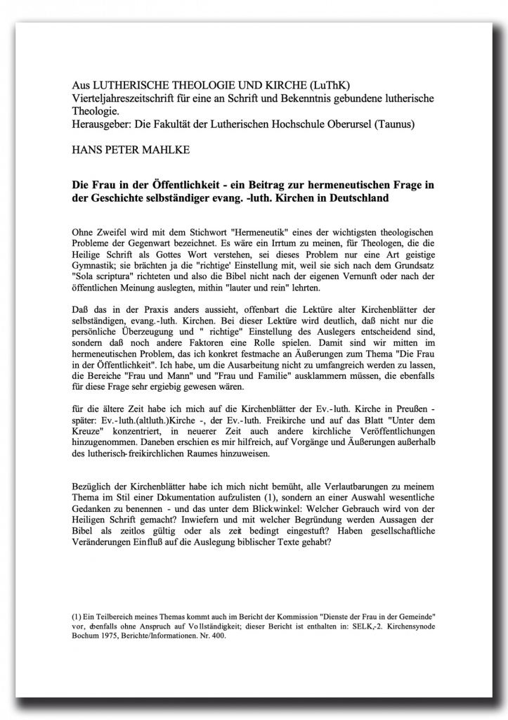 Hans Peter Mahlke behandelt in seinem 1992 in „Lutherische Theologie und Kirche“ erschienenen Artikel „Die Frau in der Öffentlichkeit“ die theologischen und historischen Entwicklungen hinsichtlich der Rolle und der Rechte von Frauen in der Kirche, insbesondere in Bezug auf die Frauenordination. Er zeigt auf, dass biblische Anweisungen und deren Auslegung im Laufe der Zeit variieren und dass viele frühere Auffassungen über die Unterordnung der Frau mittlerweile hinterfragt werden. Mahlke argumentiert, dass es keine eindeutige biblische Grundlage gegen die Ordination von Frauen gibt und dass sich die Einstellungen in der Kirche im Laufe der Zeit verändert haben sollten, um aktuellen gesellschaftlichen Gegebenheiten Rechnung zu tragen.