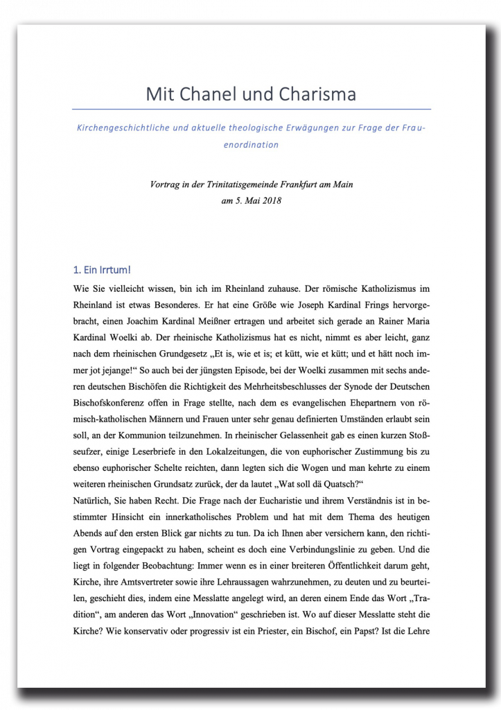 Prof. Dr. Athina Lexutt (Universität Gießen) hielt 2018 in der Frankfurter Trinitatis-Gemeinde einen Vortrag mit dem Titel „Mit Chanel und Charisma“. Sie behandelt darin die Frage der Frauenordination im Kontext der reformatorischen Theologie, insbesondere unter Berücksichtigung von Martin Luthers Ansichten zur Gleichheit aller Getauften und der Bedeutung von Bildung und Berufung in geistlichen Ämtern. Lexutt argumentiert, dass es keinen biblischen Grund gibt, Frauen vom Predigtamt auszuschließen, und dass die Reformation bereits Grundlagen für eine Gleichstellung gelegt hat, die jedoch historisch nicht konsequent umgesetzt wurden. Abschließend wird betont, dass die Suche nach Wahrheit jenseits von Tradition und Innovation erfolgen sollte, um die Frage der Frauenordination angemessen zu betrachten.