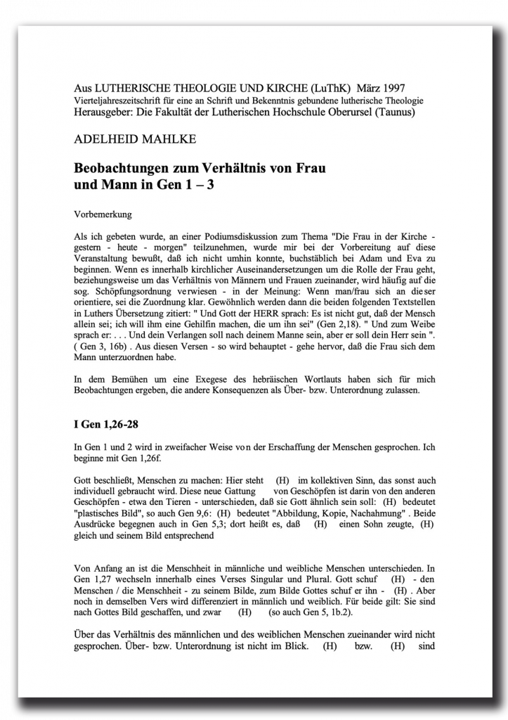 Der Artikel „Beobachtungen zum Verhältnis von Frau und Mann in Gen 1 – 3“ von Adelheid Mahlke, 1997 in der Zeitschrift „Lutherische Theologie und Kirche“ veröffentlicht, untersucht das Verhältnis von Frau und Mann in den ersten Kapiteln der Bibel, insbesondere in Genesis 1-3, und hinterfragt die gängige Interpretation von Über- und Unterordnung zwischen den Geschlechtern. Mahlke argumentiert, dass die hebräischen Texte eine Gleichstellung von Mann und Frau betonen und die Vorstellung eines hierarchischen Verhältnisses nicht im ursprünglichen Sinn der Schöpfungsordnung verankert ist. Zudem wird kritisiert, dass Übersetzungen, insbesondere die von Luther, oft eine Interpretation transportieren, die die ursprüngliche Bedeutung der Texte einschränkt und Rollenverständnisse perpetuiert.
