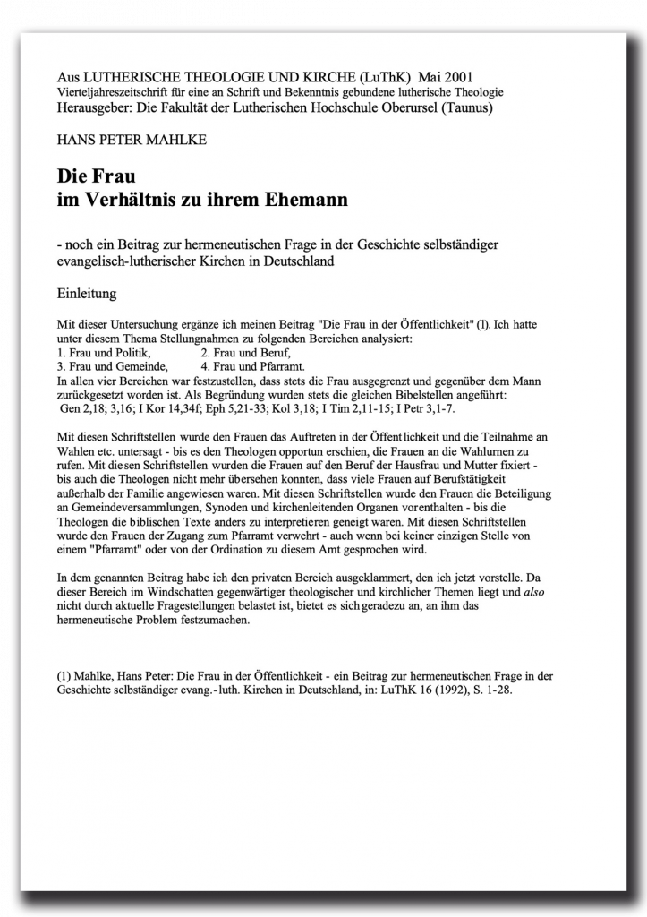 Hans Peter Mahlke stellt in seinem Artikel „Die Frau im Verhältnis zu ihrem Ehemann“ (erschienen in „Lutherische Theologie und Kirche“, Mai 2001) die Rolle der Frau im Verhältnis zu ihrem Ehemann innerhalb der lutherischen Theologie und Kirche dar, wobei er historische und aktuelle kirchliche Stellungnahmen analysiert. Er zeigt auf, dass die Bibel oft als Grundlage für die Unterordnung der Frau unter den Mann verwendet wurde, und beleuchtet die patriarchalen Strukturen, die diese Sichtweise stützen. Darüber hinaus wird die Entwicklung hin zu einer partnerschaftlicheren Auffassung der Ehe in den letzten Jahrzehnten thematisiert, die sich von den traditionellen Interpretationen entfernt hat.