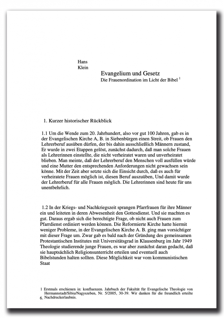 In einem 2005 veröffentlichten Artikel „Evangelium und Gesetz – Die Frauenordination im Licht der Bibel“ beleuchtet der rumänische evangelisch-lutherische Theologe Hans Klein die Entwicklung der Frauenordination in der evangelischen Kirche und die unterschiedlichen theologischen Auffassungen dazu im Licht biblischer Aussagen. Es wird aufgezeigt, dass es in der Bibel keine einheitliche Sicht über das Reden der Frau in der Gemeinde gibt und dass die relevanten Texte unterschiedlich interpretiert werden können. Der Autor argumentiert, dass die Aussagen des Neuen Testaments keine grundsätzliche Ablehnung der Frauenordination rechtfertigen und dass die Kirche in der heutigen Zeit neue Entscheidungen in dieser Frage treffen kann. Abschließend wird betont, dass es keinen theologischen Grund gibt, Frauen den Zugang zu geistlichem Dienst in der Gemeinde zu verwehren, da sich die gesellschaftlichen Bedingungen seit der biblischen Zeit geändert haben.